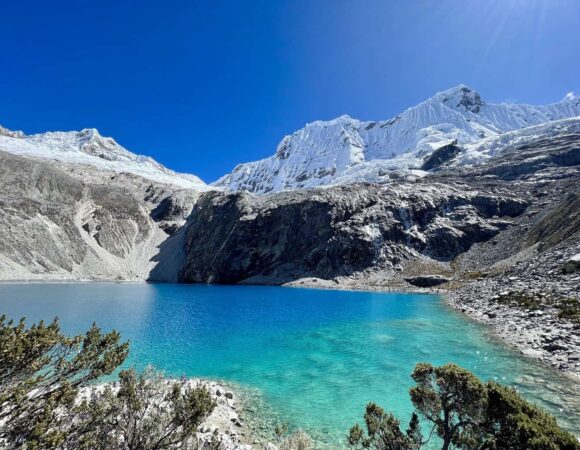 Siguiendo con el ascenso llegamos a la Laguna 69 a una altura de 4,500 msnm, llamada así porque fue precisamente la laguna número 69 en ser hallada en Huaraz, y forma parte de las más de 400 lagunas encontradas hasta la fecha en dicha región.